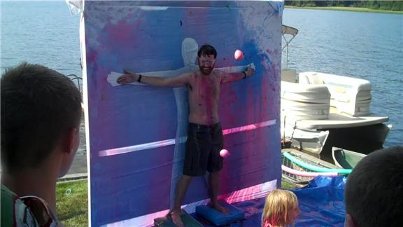 Scott McDonald stood in front of a canvas while assistants threw 50 paint balloons at him. The result is a giant abstract work of art. He set the record during their 4th of July celebration.