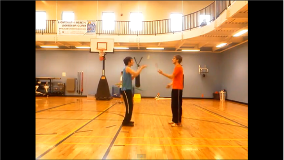 Pete Moyer and Jacob Cobetto completed 10 passes while juggling three balls in a cascade pattern while Pete hula hooped.