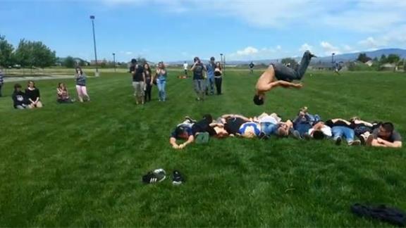 Evan Funk front flipped over 12 people lying down at once.