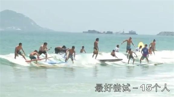 A total of 15 surfers rode a wave at once. The record was set during the XSories Jalenboo Surf and Skate Contest in Hainan, China. Read more about it here.