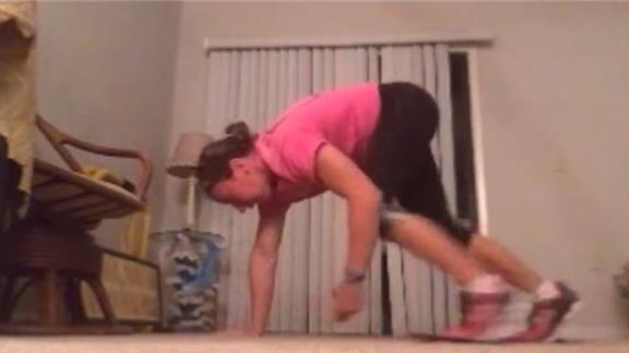 Alicia Weber performed 30 one-arm gliding mountain climber bean bag catches in one minute, 2.00 seconds.