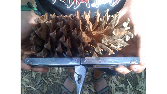 • It is possible that Crystal has found a cone from sugar pine, Pinus Lambertiana, which occurs in California. The cones from this species can be as long 12 inches. Stop being a sore loser, guy!