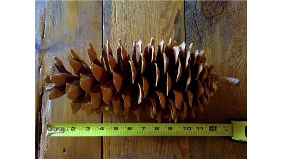 It is possible that Crystal has found a cone from sugar pine, Pinus Lambertiana, which occurs in California. The cones from this species can be as long 12 inches. Stop being a sore loser, guy!