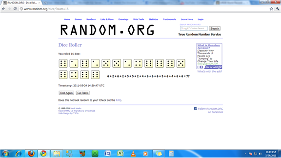 Russ Mendez turned up 77 pips after rolling 16 dice on Dice Roller.