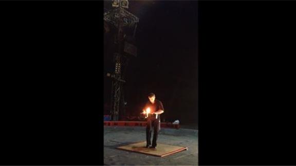 Kristian Kristof performed four pirouettes before catching a flaming cigar boxes using two cigar boxes.