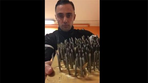 Record Setter performed three pistol squats while balancing on a wooden board with nails.