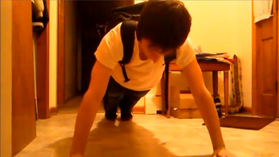 Pete Moyer, who is 18 years old, performed a plank exercise with his arms fully extended while carrying eight kilograms of additional weight on his back. He remained balanced in position for one minute, 34.42 seconds.