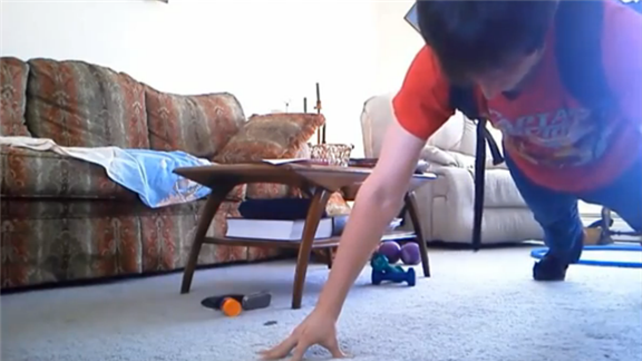 Pete Moyer, who is 18 years old, performed a plank exercise on fingertips with his arms fully extended while carrying four kilograms of additional weight on his back. He remained balanced in position for one minute, 9.10 seconds.