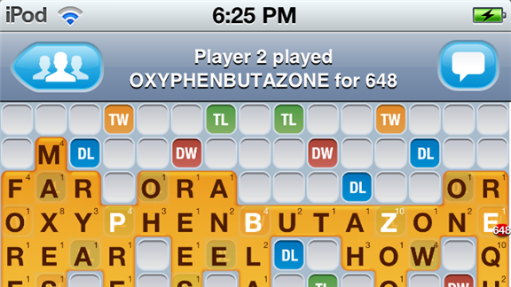 Todd Miller earned 648 points by playing the word "OXYPHENBUTAZONE" in Words With Friends.