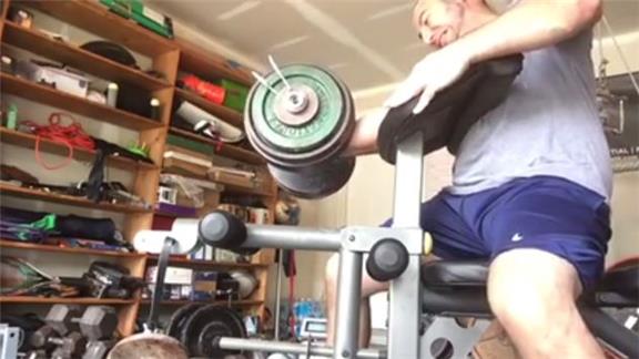 James R. completed a one-arm preacher curl with his right arm using 134 pounds.