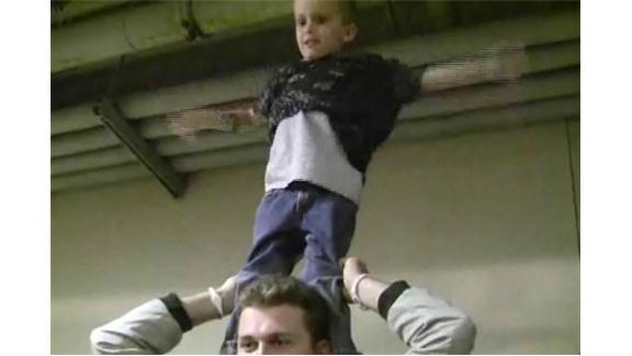 Sam Rains put on three shirts while standing on the shoulders of Ryan Johnson in 43.15 seconds.