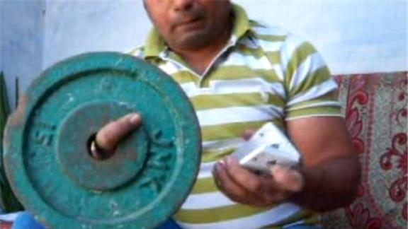 Kamal Aslam performed 20 Reverse Revolution card cuts in one minute while holding a 15-pound exercise plate on his index finger.