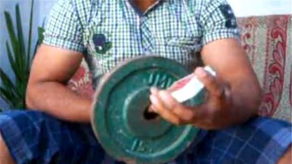 Kamal Aslam performed 19 Reverse Scissor card cuts in 30 seconds while holding a 5-pound exercise plate on his pinky finger and a 15-pound exercise plate on his index finger.