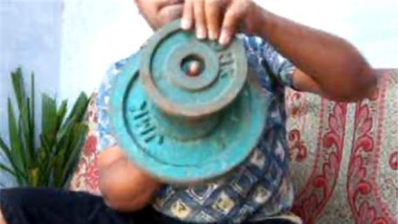Kamal Aslam performed seven Revo-Flipped card cuts in 30 seconds while holding 20-pound exercise plates on his index finger.
