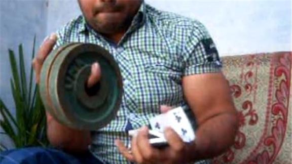 Kamal Aslam performed nine Revolution 2 card cuts in 30 seconds while holding two 5-pound exercise plates on his pinky finger.