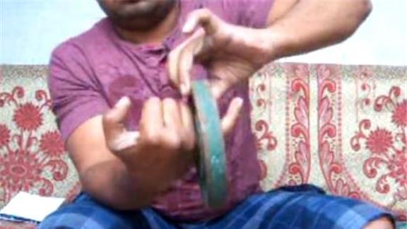 Kamal Aslam performed 19 Revolution card cuts in 30 seconds while holding a 5-pound exercise plate on his pinky finger and a 15-pound exercise plate on his index finger.