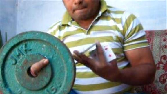 Kamal Aslam performed 40 Revolution card cuts in one minute while holding a 15-pound exercise plate on his index finger.