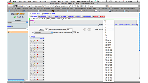 • Heya coreyh, this is a MySQL server(5.1.26-rc) hosted at mediatemple.net. This perticular database is only used for this as an experiment. It's only populated by 1's.