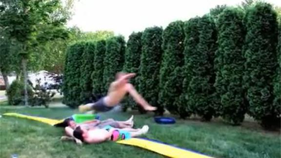 Brandon Pleshek slid along a Slip 'n Slide and jumped over three people.