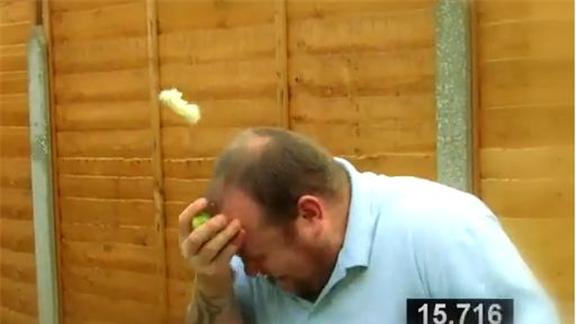 The Essex Animal smashed six apples on his head in 22.42 seconds.