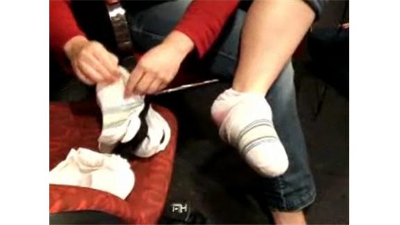 Nat, a radio DJ at Nova 93.7 in Perth, Australia, put 57 socks on her left foot while listening to ’Beat It’, a new world record.