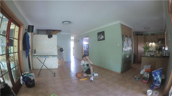 Brendan Kelbie spun a basketball on a pen held in his shoe for 21.16 seconds while balancing a 16-inch tent peg on his forehead.