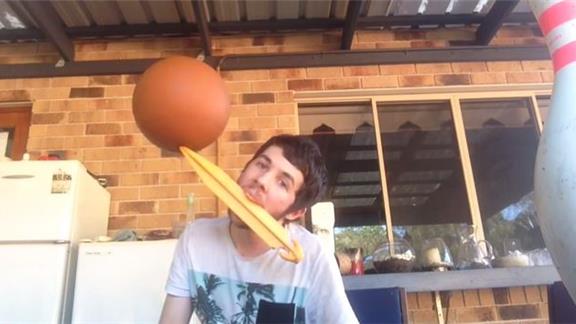 Brendan Kelbie spun a basketball on the tip of a 16-inch tent peg held in his mouth for 14.82 seconds.