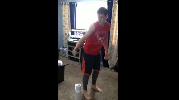 Aaron L. completed 37 squat jumps over a stack of three toilet paper rolls in one minute.