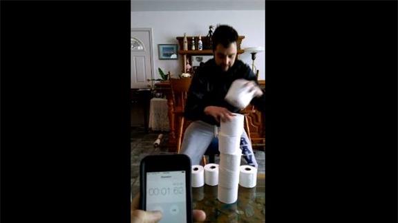 Kevin G. stacked 10 rolls of toilet papers in 4.00 seconds.