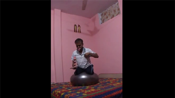 Suresh G. stacked a card tower five stories high while balancing on an exercise ball.
