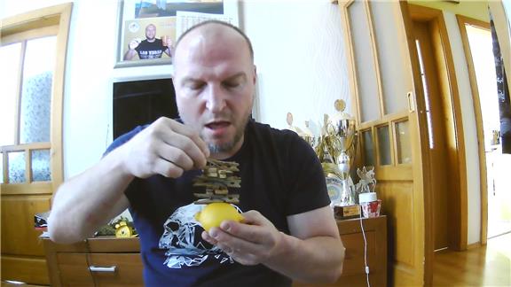 Pavol Durdik stacked 17 clothespins on a lemon held in his hand.