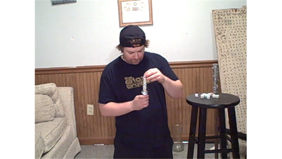 Brian Pankey stacked a dice tower on a watch face held in his hand that reached seven dice in height.