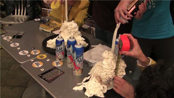 Melissa Arkin and Casey McLaughlin made a dollop of whipped cream on a mug of hot chocolate 7 1/4 inches tall during a stop on the RecordSetter book tour.