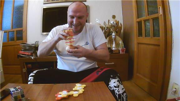 Pavol Durdik stacked nine fidget spinners on an onion held in his hand.