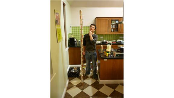 Liam Atkinson built a 12-ounce soda can tower 18 cans tall.