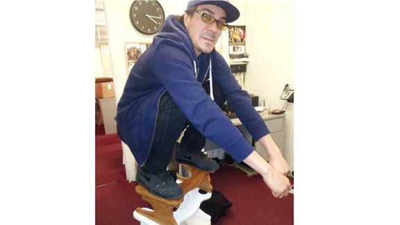 Carlo Montagnino squatted on a Squatty Potty tower three stools in height.