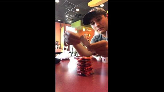 Ethan N. built a tower using Taco Bell hot sauce packets 22 packets tall.