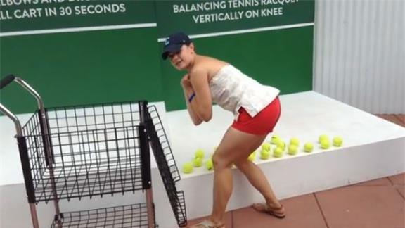 Carrie Y. picked up 16 tennis balls with her elbows and dropped them in a ball cart in 30 seconds.