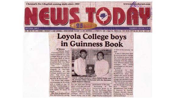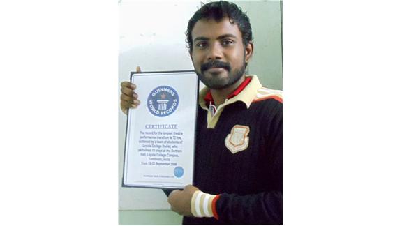 Jeeva Sathish and his college friends enacted 13 chapters from the Bible continuously for 72 hours. It took 8 hours to perform all 13 chapters, and then, after a 15-minute break, they began all over again. This was done over and over for 8 hours.