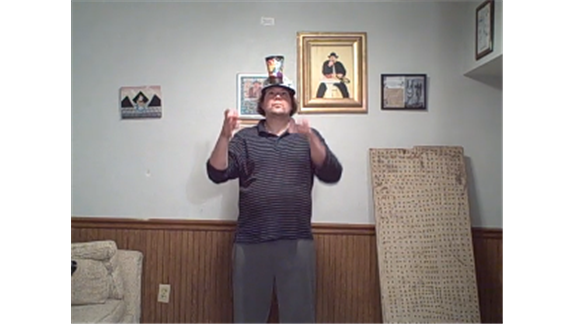 Brian Pankey tossed a table tennis ball from his hand into a Cuponk cup[] balanced on the brim of his hat four times in one minute.