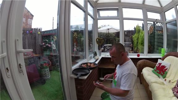 Mark Evans transferred 12 eggs from one pan to another with a spoon held in his mouth in 40.38 seconds.