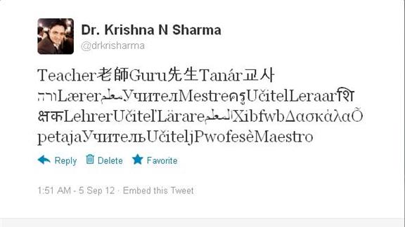 Dr. Krishna N. Sharma translated the word "Teacher" into 26 different languages and displayed them in a single tweet.