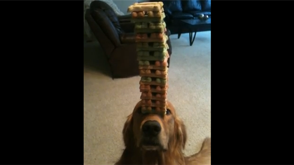 Alton Bollom balanced 50 dog treats on the nose of Carson, also known as "Jenga Dog."