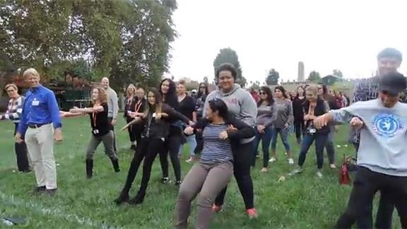 A total of 87 people from Five Acres participated in a trust fall relay. They set the record in celebration of National Adoption Awareness Month and to raise awareness about foster care and adoption.