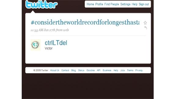 This record was broken by me in 2013 http://superofficialnews.com/guinness-world-record-for-longest-twitter-hashtag-has-been-announced/