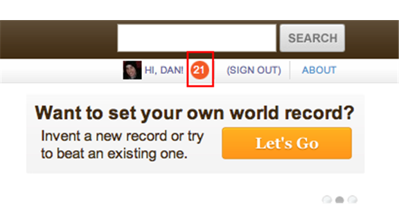 Dan Leatherman has 21 URDBnotifications on his page. The notifications refer to the number of new Comments that have appeared on world records he’s following. They’re marked by an orange circle next to his name.