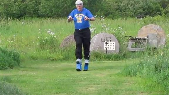 Doug McManaman walked 100 yards in one minute, 36.93 seconds while wearing 10-inch stilts on his feet and balancing eggs on the back of his hands.