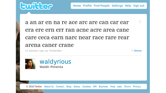 Anyway, I just submitted my 32-word take on this. If that fails, I have a backup 31-word using only words accepted in Firefox's dictionary, which is also a perfect tweet (exactly 140 chars).