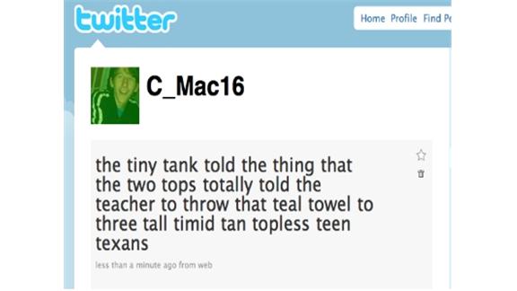 "timmy" is not a word. "tim" is not a word. "twatted" is not a word. "telled" is not a word. "twitterd" is spelled incorrectly. this record should be reduced from 21 to 16.