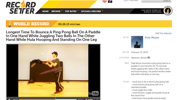 Pete Moyer set the record, "Longest Time To Bounce A Ping Pong Ball On A Paddle In One Hand While Juggling Two Balls In The Other Hand While Hula Hooping And Standing On One Leg" on February 16, 2012. The record contains 30 words on its title.